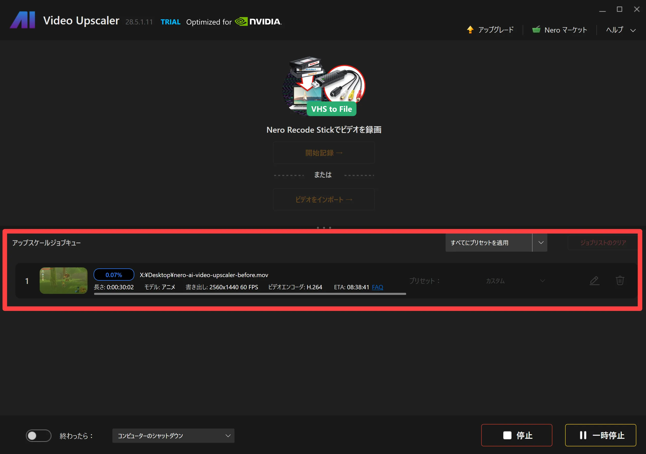 処理中の動画はホーム画面の[アップスケールジョブキュー]欄に表示されます。